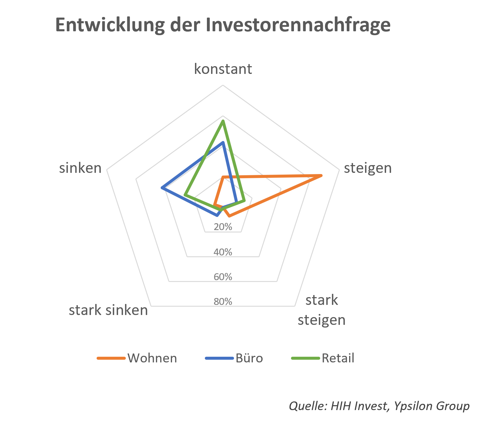 Der Bürosektor bleibt das Sorgenkind: Einundsechzig Prozent der Befragten gehen von sinkender Nutzernachfrage aus, vierundfünfzig Prozent erwarten, dass Mieten nachgeben werden, zwei Drittel gehen von Preisrückgängen aus.